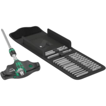 17-teiliger Satz in robuster textiler Box. 1 Quergriff-Bits-Handhalter 416 RA mit Ratschenfunktion und Rapidaptor Schnellwechselfutter für ¼" Bits. Die integrierte Ratsche mit Feinverzahnung (80 Zähne/Rückholwinkel 4,5°) vereinfacht und beschleunigt das Schrauben ohne mühsames Neuansetzen. Die vollständig in den Griff eingebettete Knarrenmechanik sorgt für sehr handliches und angenehmes Arbeiten. Mit Umschalthebel für bequemen Rechts/Links Richtungswechsel in Einhand-Bedienung. Die ergonomische Form des Griffs füllt den Handballen gut aus, die Finger liegen sicher in den weich gerundeten Griffmulden. Die ganze Hand findet Kontakt zum Griff, Reibungsverluste zwischen Hand und Griff werden vermieden. Bithalter für Bits mit 1/4" Außensechskantantrieb nach DIN ISO 1173-C 6,3 und E 6,3. Mit Rapidaptor-Technologie für blitzschnelles Wechseln der Bits. 16 zähharte Bits, ¼", 89 mm lang, für den universellen Einsatz.