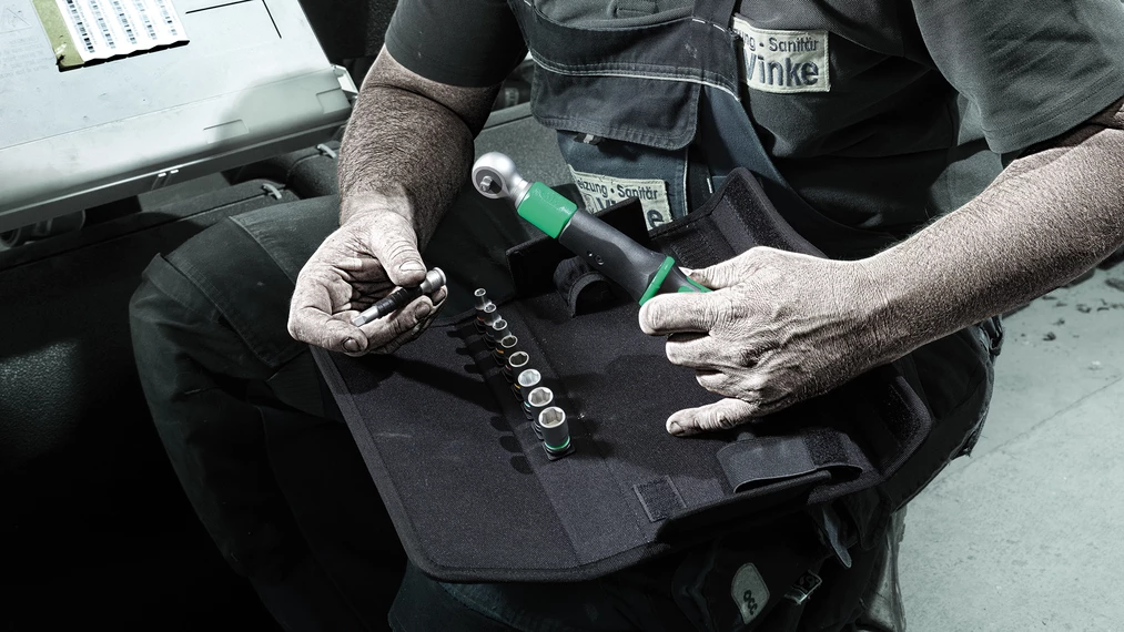 10-teiliger 1/4" Drehmomentschlüssel-Satz in robuster textiler Box; Drehmomentschlüssel mit Überrutschmechanik. Nach Erreichen des eingestellten Drehmomentwertes kann das Werkzeug nicht überzogen werden, so dass das Aufbringen eines zu hohen Drehmomentes ausgeschlossen ist. Einstellbereich von 2 bis 12 Nm für kontrollierten Rechts- und Linksanzug. Einfache Einstellung und Sicherung des Vorgabewertes: Das hör- und fühlbare Einrasten bei Erreichen der Skalenwerte erleichtert zusätzlich die sichere Einstellung des gewünschten Drehmomentwertes. Mit Torque Lock Funktion zur Nutzung als Standardknarre ohne Drehmomentfunktion. Kann somit auch für Drehwinkel-Anwendungen genutzt werden. Max. Bruchdrehmoment des ¼" Vierkant gemäß DIN 3122. Der Rückholwinkel beträgt nur 5°, so dass die Knarre auch in engen Arbeitssituationen eingesetzt werden kann. Enthalten sind: Drehmomentschlüssel Safe-Torque A 1, 1/4" Vierkant, 2-12 Nm, 8 Nüsse mit 1/4" Antrieb und 1 kurze Verlängerung.