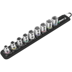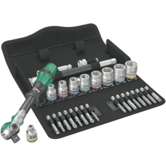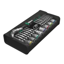 Incredibly compact set arrangement with many tools in a minimum of space. A completely new ratchet set feeling thanks to the unique textile boxes that are very robust and durable. They can be positioned upright for tidy storage on the workshop shelf. Additional surface protection due to textile outer material. Low weight and volume for simpler mobility. Take it easy Tool Finder with colour coding according to sizes.