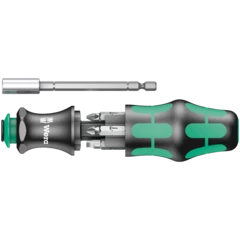 Wera compact tools enable both manual as well as power tool operations at the same time. The handle/interchangeable blade system in a compact design with various blade tips in the smallest of spaces makes the user more mobile and flexible. Suitable for bits with ¼" hexagon head drive as per DIN ISO 1173-C 6.3 and E 6.3 (ISO 1173) and Wera connecting series 1 and 4. Comes with an adaptor, bayonet and Rapidaptor technology. Kraftform handle with anti-roll feature, multi-component for particularly ergonomic screwdriving. Integrated magazine for bit storage. The telescopic bayonet blade - which can be lowered into the handle - together with the quick-release chuck allows fast manual work even in confined installation situations when the blade is retracted. The blade can be extended by simply actuating the locking sleeve. The bayonet holder can then be used as a fully-fledged screwdriver. The bayonet blade can be removed and used as a power tool adaptor, but can also be retracted once again to its original position. Includes practical belt pouch.