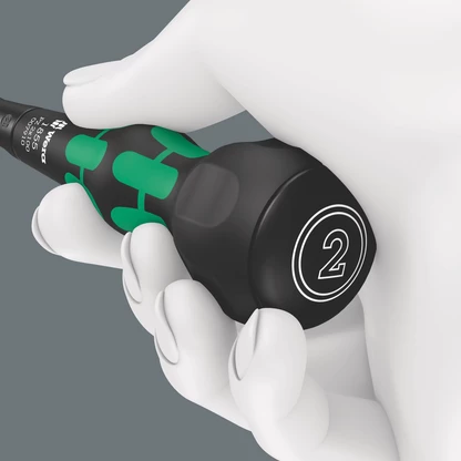 Screwdriver with Kraftform series 1800 handle for Pozidriv screws. The handle fits perfectly in the hand. The convex shape allows the transmission of high torques. The soft handle zones ensure a good grip and low-loss power transmission. The hard handle zones allow a high power transmission, even when pressure is applied with the ball of the hand. The recesses at the upper end of the handle facilitate fine adjustment while screwdriving. Due to the narrow transition between handle and blade, even sunken screws in narrow areas can be easily reached. The anti-roll protection at the rear end of the handle hinders the tool from rolling away annoyingly at the workplace. The tips of Wera Lasertip screwdrivers are microscopically roughened with laser beams. This rough surface "bites" into the screw head which avoids unintentional slipping out of the screw.