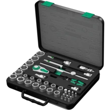 38-piece Zyklop set in robust metal case: Zyklop ratchet with 1/2"drive. The 72 fine-pitched teeth enable a low return angle of only 5°. The ratchet head pivots freely and can be locked into any position by using the slide switch that is positioned on either side. It is even possible to work conveniently in very confined and difficult-to-access areas with enhanced hand clearance. The predefined locking positions at 0°, 15° und 90°, both to the right and left, ensure safe working without any slipping of the ratchet head. The ratchet can be used as a conventional screwdriver in the 0° position by attaching an adaptor and a bit. The flywheel design ensures rapid screwdriving. The rotation-symmetric construction of the Kraftform handle and the free-turning sleeve support rapid twisting. The outstanding design of the Kraftform handle fits perfectly into the hand preventing hand injuries such as blisters and calluses. The hard materials used for the handle ensure quick and easy hand repositioning without any danger of the skin "sticking" to the handle. The softer anti-slip zones enable the low-loss transfer of high torque. For 1/2" square sockets as well as 1/2" adaptors with square drive, equipped with ball lock. Including 18 imperial Zyklop sockets, 2 Zyklop extensions with free-turning sleeve, 1 T-handle, 1 universal joint, 1 "Wobble" extension, 1 adaptor with quick-release chuck, 13 bits. Take it easy Tool Finder with colour coding according to sizes.