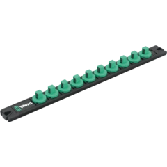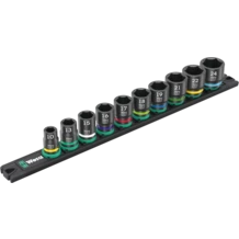 Socket rail with 10 Impaktor socket wrenches for use with electric or pneumatic wrenches with 3/8" drive. The Impaktor technology ensures a higher-than-average service life even at extreme requirements. The hexagon profile used allows a high power transmission while simultaneously being precise and protecting the profile. With Take it easy Tool finder with colour coding by size - for quick and easy identification of the required tool. The rail allows temporary attachment to metallic surfaces and, with its twist-to-unlock function, ensures secure locking and unlocking of the sockets.