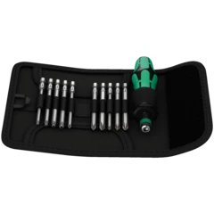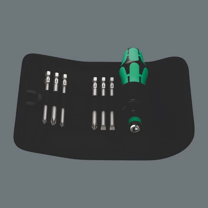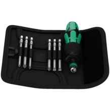 Pouch with 89-mm long bits. Includes 816 R Kraftform holder with Rapidaptor quick-release chuck and multi-component Kraftform handle for low-fatigue working.
