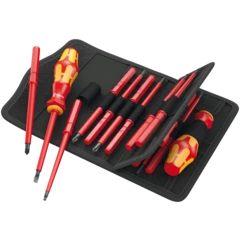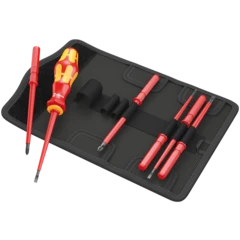 14 VDE interchangeable blades with reduced blade diameter so that even low-lying screw and spring elements can be accessed and actuated. 817 VDE Kraftform handle for ergonomic working and single-pole phase tester in a robust belt pouch. Individually tested tools as per IEC 60900. Individual test at 10,000 volts for secure work at the permissible voltage of 1,000 volts.