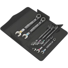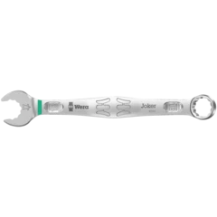 Llave carraca de boca y anillo Joker con dobladura al lado de la carraca así como con palanca de conmutación. Con función de retención gracias a la placa metálica en la boca que reduce el riesgo de que se pierdan tornillos o tuercas. El tope final integrado es capaz de evitar el deslizamiento de la cabeza del tornillo hacia abajo y permite aplicar altos pares de giro. Con sus dientes extra-duros, la placa metálica intercambiable en la boca asegura los tornillos y las tuercas, y reduce así el riesgo de resbalamiento. La geometría de doble hexágono permite una unión completa con el tornillo o la tuerca y contribuye de esta forma igualmente a reducir el riesgo de deslizamientos. El pequeño ángulo de retorno de tan sólo 30° al lado de la boca evita el tener que darle la vuelta a la llave durante los trabajos de atornillar, y así ayuda a ahorrar tiempo. El mecanismo de carraca conmutable al lado del anillo con la dentadura fina de 80 dientes, permite una gran flexibilidad, también en espacios estrechos. El mecanismo de carraca es audiblemente preciso. Además, el elemento de encastramiento de dos piezas proporciona una enorme estabilidad y firmeza. El lado de la carraca con su dobladura en 15° permite un trabajo seguro en altos pares de giro. La geometría de forja especial permite la transmisión de altos pares y ofrece gran rigidez torsional. Se elabora en acero de cromo-molibdenio de gran eficiencia y dispone de una capa de níquel y cromo para una mayor protección anticorrosiva. Lleva el sistema de búsqueda fácil de herramienta Take it easy: se dispone de una marcación de la herramienta según el tamaño.