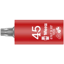 Las herramientas TORX® HF desarrolladas por Wera se caracterizan por una optimización geométrica del perfil original tipo TORX®. Gracias a la fuerza de apriete que resulta de la presión superficial entre la punta de salida y el perfil del tornillo, los tornillos TORX®, fabricados bajo las especificaciones de Acument Intellectual Properties, se mantienen seguros en la herramienta.