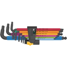 9 Llaves acodadas con revestimiento de plástico (SPKL) de material cilíndrico de fácil agarre. El revestimiento hace que el trabajo sea agradable incluso a bajas temperaturas y protege los dedos. Todas las llaves acodadas son rápidas de reconocer gracias a su código de colores y su marcado del tamaño. El material libre de desgasta del clip, garantiza una sujeción segura de las llaves acodadas y una fácil extracción. para tornillos hexagonales.
