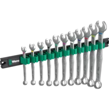 Juego de llaves de boca y anillo, de 11 piezas, medidas métricas; en un listón de muelles. Gracias a la combinación de la boca doblada en un ángulo de 7,5° y la geometría de doble hexágono, la llave Joker 6003 logra una duplicación de los puntos de posicionamiento inicial. Al darle la vuelta a la llave de forma reiterada en 180° a lo largo de su eje longitudinal durante el trabajo de atornillar, se dan cuatro posibilidades de posicionamiento, y las cabezas de los tornillos y las tuercas se pueden - por decirlo así - agarrar cada 15°. De esta forma es mucho más fácil atornillar dentro de espacios de montaje estrechos. El lado del anillo es delgado, pero sin embargo muy robusto, y está dobaldo en un ángulo de 15° hacia el eje del útil. Gracias a la bonificación de alta calidad de la superficie, se consigue una protección anticorrosiva muy alta y sostenible. Lleva el sistema de búsqueda de herramientas Take it easy: con marcas a color según el tamaño. Los muelles de sujeción que integra el listón permiten un alojamiento perfecto y seguro de los útiles. Gracias al fuerte imán que lleva, el listón se mantiene de forma segura en superficies metálicas. De forma alternativa, el listón también se puede atornillar en la pared.