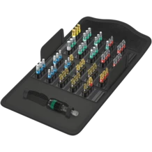 Caja robusta de material textil con puntas y porta-puntas, de 61 piezas. Contiene 49 puntas BiTorsion para una larga vida útil, en versión de recubrimiento de diamante (BDC) para un mejor encajamiento en el tornillo, duras y resistentes (BTZ), para la aplicación universal, extra-duras (BTH); 11 puntas, duras y resistentes (Z), para la aplicación universal. Además 1 porta-puntas universal 889/4/1 K con sistema de cambio rápido para la inserción en la máquina destornilladora o la conexión con el taladro electrónico. El perfil y el tamaño de las puntas son fácilmente reconocibles gracias al sistema de búsqueda fácil Take it easy con sus codificaciones a color y su letra claramente visible. La caja de material textil le permite al ususario una gran movilidad sin que se necesite mucho espacio. El peso claramente reducido de este juego hace más cómodo el transporte de la herramienta. Las superficies delicadas no sufren si se deposita la caja encima de las mismas, y además se trata de un alojamiento muy robusto de los útiles. Incluso en caso de que se caiga al suelo, la caja y la herramienta que contiene no sufrirá daño alguno.