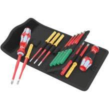 2 porta-puntas 3817 VDE Kraftform para un trabajo ergonómico. 15 varillas VDE intercambiables de acero inoxidable, en parte con un diámetro reducido de las varillas (iS), así también es posible acceder a elementos de uniones atornilladas y de muelles a profundidad, y realizar los trabajos necesarios; lleva el sistema de búsqueda de herramientas Take it easy: con marcas a color según el perfil e indicaciones del tamaño grabadas con láser - para encontrar la herramienta precisa más facil- y rápidamente. Las herramientas han sido probadas en un 100 % según IEC 60900. La prueba individual se realiza bajo una tensión de 10.000 V para asegurar un trabajo seguro bajo la tensión permitida de 1.000 V. Las herramientas de acero inoxidable de Wera han sido endurecidas por congelación al vacío, y así disponen de los valores de dureza y resistencia que se necesitan para los trabajos de atornillar. El uso industrial es posible sin ninguna clase de limitaciones. Vienen en un bolso robusto para llevar en el cinturón. El bolso lleva un sistema autoadhesivo en su parte posterior, y se puede conectar así con los componentes de Wera 2go, pero también es posible fijarlo en la pared, la estantería o el carro de herramientas del taller.