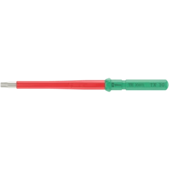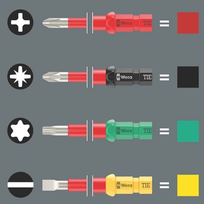 - Varillas intercambiables VDE (de 157 mm) con función práctica de giro superrápido, sistema antirrodamiento, así como el sistema de búsqueda de herramientas Take it easy: marcas a color según el perfil y sellos grabados a láser con el tamaño