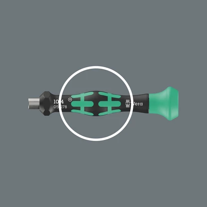 Kraftform Micro -ruuvitalttakahva, jossa ergonominen kahva mukavaan ja väsyttämättömään työskentelyyn. Kraftform Micro -kahva täyttää kolmella erityisesti sijoitellulla alueellaan (tarkkuus-, voima- ja nopean pyörittämisen alueilla) nämä vaatimukset täydellisesti. Pyörivä kahvan pää, johon käden voi tukea, tukee näitä etuja ihanteellisesti. Kierimisenesto estää työkalua vierimästä pois paikoiltaan työskentelypaikalla. Sopii Bits-kärjille, joissa on 4 mm:n kuusiokantakiinnitys.