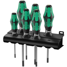 6-osainen ruuvitalttasarja, jossa Kraftform-kahva miellyttävään ergonomiseen työskentelyyn, estää rakkuloiden ja kovettumien syntymisen. TORX® BO ruuveilla on ruuvinkannassaan ulkoneva tappi. Tämä estää luvattoman irrottamisen, koska näitä ruuveja ei voida käyttää tavallisten TORX® työkalujen kanssa. Vain erityisissä TORX® BO työkaluissa on reikä, johon ruuvin tappi mahtuu. Wera Black Point -kärki ja huolellisesti tehty karkaisu takaavat kärjen pitkän käytettävyyden, hyvän korroosiosuojan ja suuren tarkkuuden. Kuusikantainen kierimisenesto estää työkalua vierimästä pois paikoiltaan. Merkintä kahvassa helpottaa työkalun löytämistä ja lajittelua. Mukana käytännöllinen teline ruuvitalttojen helppoon säilytykseen.