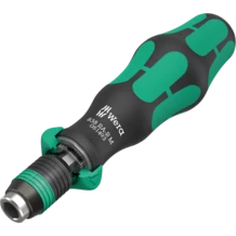 Bits-ruuvitalttakahva, jossa intuitiivisesti käytettävä räikkätoiminto. Kahvaan integroitu räikkämekanismi, jossa on hieno hammastus (36 hammasta / 10 asteen palautuskulma), helpottaa ja nopeuttaa ruuvaamista ilman työkalun uudelleen asettamista. Mahdollisuus pyörittää räikkää sormilla nopeuttaa työtä. Täysin kahvaan upotettu räikkämekanismi takaa erittäin kätevän ja vaivattoman työskentelyn. Ergonominen vaihto myötä-/vastapäivään tai 0-asentoon. Kraftform Plus -kahva takaa ergonomisen työskentelyn ja estää rakkuloiden ja kovettumien syntymisen. Magneettinen Bits-kärkipidin Bits-kärjille, joissa on 1/4" kuusiokantakiinnitys standardien DIN ISO 1173-C 6,3 ja E 6,3 (ISO 1173) mukaan. Rapidaptor-pikaistukka mahdollistaa Bits-kärkien salamannopean vaihtamisen ilman apuvälineitä. Vahva kestomagneetti pitää Bits-kärjet pomminvarmasti paikoillaan.