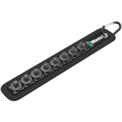 Sangle porte-outils en textile très résistant et design Wera, avec 9 douille-embouts, sur un espace réduit. Le mécanisme "Twist to Unlock", très souple, assure un maintien en toute sécurité et un retrait facile des douilles. Avec le système Take it easy une couleur = une dimension afin de trouver très facilement l'outil nécessaire. Un mousqueton permet la fixation au passant de ceinture ou à une sacoche. Douille-embouts particulièrement courtes et robustes présentant tous les avantages de la technologie Wera. Embout-douille à fonction de retenue pour un vissage simple sans risque de perdre la vis lors du montage. Verso en scratch pour une fixation simple, au mur, à l'étagère, à la servante d'atelier ou au système de transport d'outils Wera 2go.