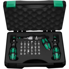 Kit della Wera di giraviti dinamometrici. Due giraviti dinamometrici con impostazione variabile della coppia alla massima precisione. Un giravite dinamometrico con l'impugnatura a pistola Kraftform per una trasmissione di coppie particolarmente elevate, multicomponente per lavorare in maniera rapida ed ergonomica. Facile impostazione della coppia senza utensili ausiliari. Facile lettura dei valori. Tecnologia a cambio rapido Rapidaptor per un cambio ultrarapido degli inserti. Coppia di allentamento illimitata per svitare viti grippate. Impugnatura Kraftform multicomponente con zone dure e zone morbide per velocizzare il lavoro proteggendo il palmo della mano. Compreso di assortimento d'inserti in una valigetta in plastica robusta e di ottima qualità.