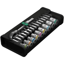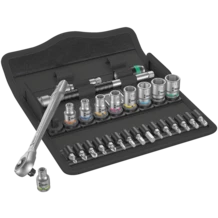 Sistemazione incredibilmente compatta del kit per avere tanti utensili in poco spazio. Il kit di cricchetti si trova in una nuova borsa in materiale tessile molto resistente da sistemare anche in posizione verticale per trovare più facilmente gli utensili nello scaffale dell'officina; la borsa in materiale tessile non graffia le superfici delicate; peso e ingombro ridotti per un trasporto più facile. Con il trova-utensili Take it easy con codice cromatico per le diverse dimensioni.
