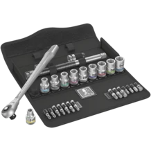 Sistemazione incredibilmente compatta del kit per avere tanti utensili in poco spazio. Il kit di cricchetti si trova in una nuova borsa in materiale tessile molto resistente da sistemare anche in posizione verticale per trovare più facilmente gli utensili nello scaffale dell'officina; la borsa in materiale tessile non graffia le superfici delicate; peso e ingombro ridotti per un trasporto più facile. Con il trova-utensili Take it easy con codice cromatico per le diverse dimensioni.
