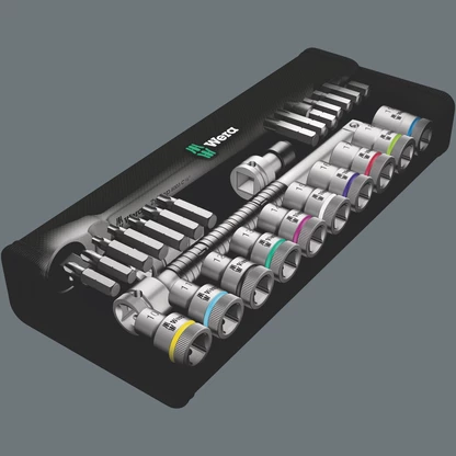 Il trova-utensili Take it easy con colori diversi a seconda della misura per trovare più facilmente e più velocemente l'utensile necessario. Indicazione cromatica a seconda della dimensione per gli utensili per viti ad incavo quadro (chiavi a L e bussole per inserti Zyklop), viti e dadi esagonali (chiave fissa Joker, bussole Zyklop e bussole Zyklop con funzione di ritegno trattengono le viti sull'utensile in modo sicuro.) e viti TORX® (chiavi a L, bussole per inserti Zyklop).