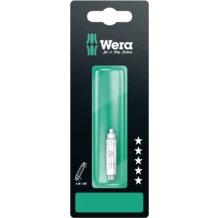 Con soltanto un inserto possono essere azionati quattro diversi profili di viti (esagono incassato misure 2,5; 5,0; 6,0 e TORX® T 25 ). L'inserto risulta pertanto ideale per l'impiego in mobilità grazie al notevole risparmio di spazio. Un risparmio di peso di oltre il 50% . La funzionalità dei profili grossi viene resa possibile dai profili piccoli a molla. L'inserto ha un attacco esagonale da 1/4" (Wera attacco serie 1) ed è utilizzabile anche con p.es. cricchetto per inserti e impugnature portainserti con Rapidaptor.