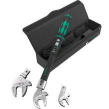 Assortimento 4 pezzi - Chiave dinamometrica Click Torque con 3 chiavi forchetta autoregolabili intercambiabili Joker. Per il corretto serraggio degli avvitamenti per l'installazione e la riparazione di impianti di refrigerazione e condizionamento dell'aria, nonché di pompe di calore. Chiave dinamometrica Klick nell'inconfondibile Wera Design. Versione molto robusta con elevata precisione secondo DIN EN ISO 6789-1:2017-07. Facile regolazione e bloccaggio del valore di coppia desiderato. Il robusto meccanismo di scatto garantisce un segnale ben udibile e sensitivo al raggiungimento della coppia impostata. Per il serraggio destrorso e sinistrorso con attacco quadro 14x18 mm per l'inserimento del corrispondente utensile intercambiabile. Le tre chiavi a forchetta autoregolabili intercambiabili Joker 7880 sostituiscono molte misure singole di chiavi grazie alle ganasce parallele in continuo. La misura richiesta si autoregola in continuo al posizionamento sulla vite o dado esagonale. La funzione a cricchetto consente avvitamenti rapidi e coerenti senza doversi riposizionare.