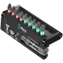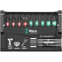 Bit-Check robusto della Wera. I Bit-Check consentono di individuare rapidamente l'utensile giusto. Gli inserti che non vengono utilizzati possono essere rimessi nel Bit-Check e non vanno persi. Facili da trasportare, ad es. nel taschino di una camicia. La tecnologia Impaktor per avvitatori ad impulso, fa sì che l'utensile raggiunga una durata straordinaria anche in presenza di forti sollecitazioni. Il rivestimento ruvido di diamanti, grazie all'elevata resistenza di attrito, riduce il rischio che l'utensile scivoli dalla vite. Portainserti Impaktor per assorbire i picchi d'impulsi. Speciale effetto di torsione grazie alla molla doppia di torsione. Con magnete ad anello per mantenere anche viti pesanti e lunghe, ideale per lavori a braccia alzate, adatto in particolar modo per l'uso con gli avvitatori ad impulso / a percussione attualmente sul mercato. Il magnete può essere spostato indietro e quindi essere disattivato.