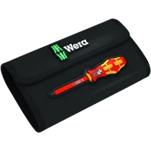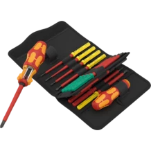 17 pezzi - Assortimento Kraftform Kompakt isolato VDE. 1 Impugnatura portalama con funzione cricchetto (40 denti, angolo di richiamo 9°), 1 impugnatura portalama 817 isolata VDE, 15 lame intercambiabili isolate VDE con trovautensili Take it easy: identificazione cromatica a seconda del profilo e marcatura della misura incisa al laser. Utensili testati singolarmente secondo IEC 60900. Testati in bagno d'acqua a 10.000 V per lavorare in sicurezza con una tensione massima ammessa di 1.000 V. In robusta custodia da cintura.
