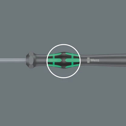 Assortimento giravite Wera Micro per avvitamenti nella meccanica fine. Posizionando la mano sul cappuccio girevole e grazie alla zona di rotazione rapida, posta sotto il cappuccio girevole, è possibile una rotazione velocissima del giravite. Non si perde tempo per afferrare. Conservazione e trasporto in robusta custodia, con utensili sempre a portata di mano. Con il trova-utensili Take it easy: identificazione cromatica a seconda del profilo e identificazione e grandi caratteri.