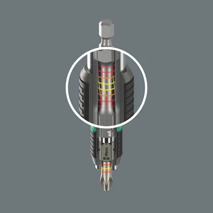 Bij het schroeven met een machine kunnen belastingspieken ontstaan, die voor vroegtijdige slijtage van de bit of beschadiging van de schroef zorgen. Als deze belastingspieken worden gereduceert wordt het werken productief en veilig. Het Wera BiTorsion-Systeem voorkomt vroegtijdige slijtage. De levensduur van het gereedschap wordt verlengt en de productiviteit bij het schroeven met machines wordt aanzienlijke verhoogd.