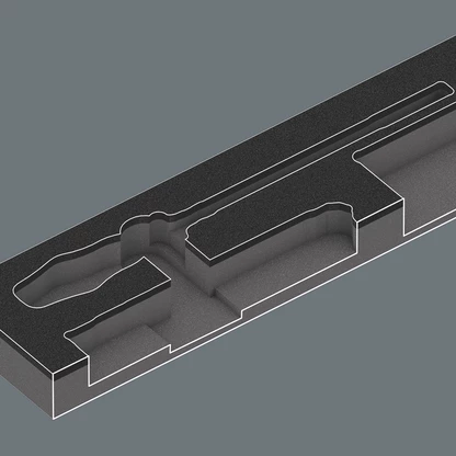 Duurzaam schuimrubberen inzetstuk; 2-kleurig om ontbrekende onderdelen snel te herkennen; geschikt voor de Tool Rebel werkplaatswagen; met Wera Kraftform Kompakt 60 schroevendraaiers, Tool-Check PLUS en 393 S bithandhouder, extra smal met flexibele schacht.