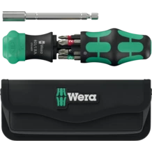 Kraftform handhouder voor 1/4" bits. De in de greep geïntegreerde ratel met fijne vertanding maakt snel werken mogelijk. Het omschakelen van de schroefrichting is volledig intuïtief: als de ringschakelaar naar rechts wordt gedraaid, kan rechtsom worden geschroefd, terwijl linksom kan worden geschroefd als de ringschakelaar naar links wordt gedraaid. Om nauwkeurig te kunnen werken kan het ratelmechanisme worden gedeactiveerd door de 0-stand te kiezen. Inclusief 6 BiTorsion bits met een lange levensduur, taai-hard, voor universeel gebruik; opgeborgen in de handgreep geïntegreerde bithouder. De sterke permanente magneet in de 1/4" bitopname zorgt voor een veilige positionering van de bits. De Kraftform 2-componenten handgreep met geïntegreerde harde en zachte delen zorgt voor een goede grip en maakt nauwkeurig werken mogelijk. Met robuust vouwetui dat met de bijgeleverde zelfklevende klittenbandstrips aan Wera 2go of tegen de muur, tegen een rek of aan een werkplaatswagen kan worden bevestigd.