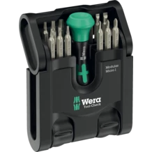 Super compacte 21-delige gereedschapsset voor fijnmechanische schroefwerkzaamheden. 1 handhouder Kraftform Micro 1014, geschikt voor bits met 4 mm buitenzeskant-aandrijving, 20 bits met 4 mm buitenzeskant-aandrijving voor kruiskopschroeven (Phillips en Pozidriv), TORX®, binnenzeskant- en sleufschroeven. Taai-hard, voor universeel gebruik. 1 adapter 9549, waarmee de verschillende Tool-Check Modular onderdelen onderling kunnen worden gekoppeld. In compacte Tool-Check Modular Micro 1.