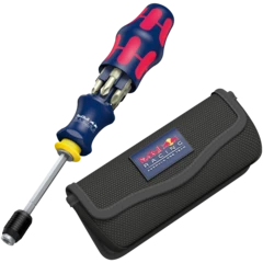 1 Zyklop Speed Ratchet with 1/4" drive, 9 Zyklop sockets, 1 Zyklop extension (long) with free-turning sleeve, 1 "Wobble" extension, 1 adaptor with quick-release chuck, 15 bits
