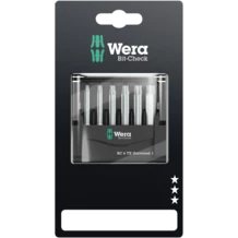 6 50 mm-long Wera TORX® bits tidily arranged in a minimum of space in a practical Bit-Check. The tough viscous bits are suitable for universal use.
