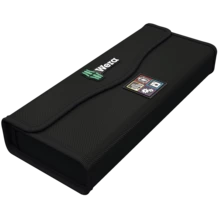 Compact tool set with the 35 most important screwdriving tools for maintenance work both indoors as well as outdoors. One Kraftform 817 VDE bladeholding screwdriver solely for Wera VDE blades; 12 VDE blades (each 157 mm length) with Take it easy tool finder with colour coding by profile and laser-engraved size indication; 1 Joker double open-end wrench with holding function, limit stop, small return angle and extremely gripping teeth; the incredibly fast ¼" Zyklop Speed ratchet and accessories; 8 manual and power tool sockets, sizes 5.5-13, 1 universal bit holder; 7 bits in a length of 25 mm; 1 screw gripper for firmly holding screws; 1 single-pole phase tester 247; textile box, very robust and durable; can be positioned upright in the workshop shelf for convenient storage; additional surface protection thanks to the textile outer material; low weight and volume for simplified mobility.