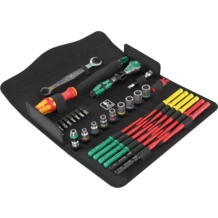 Compact tool set with the most important screwdriving tools for maintenance jobs both indoors as well as outdoors. One Kraftform 817 VDE bladeholding screwdriver solely for Wera VDE blades; 12 VDE blades (each 157 mm length) with Take it easy tool finder with colour coding by profile and laser-engraved size indication; 1 Joker double open-ended wrench with holding function, limit stop, small return angle and extremely high-grip toothing; incl. the incredibly fast 1/4" Zyklop Speed ratchet with accessories; 8 manual and power tool sockets in the dimensions 5.5-13, 1 universal bit holder; 7 25mm bits; 1 screw gripper to firmly hold screws; textile box that is very robust and durable; can be positioned upright in the workshop shelf for tidy storage; additional surface protection thanks to the textile outer material; low weight and volume for simplified mobility.