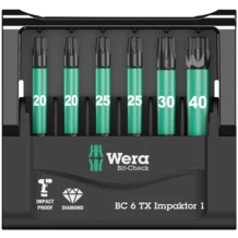 6 битов Wera Impaktor удобно и компактно размещены в практичном наборе Bit-Check. Благодаря наилучшему использованию свойств материала и оптимальному подбору геометрических параметров технология Impaktor обеспечивает изделиям срок службы, превышающий средние показатели даже с учетом жестких условий их применения. Наконечник бита покрыт мельчайшими алмазными частицами и за счёт сопротивления трением снижает выскальзывание из винта.