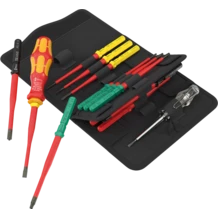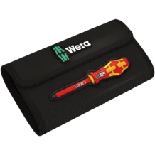 1 ручка-держатель 817 VDE Kraftform и 14 сменных отвёрток VDE с идентификатором инструментов Take it easy: цветовая кодировка и лазерная гравировка размера. С зауженным рабочим концом и защитной изоляцией, это позволяет получить доступ к глубоко посаженным винтовым и пружинным элементам и работать с ними. Инструменты проверены поштучно по стандарту IEC 60900. Поштучная проверка под напряжением 10000 В для безопасной работы на оборудовании с допустимым напряжением 1000 В. 1 однополюсный тестер фазного напряжения. В добротной поясной сумке. Мягкая сумка имеет с обратной стороны зону на липучках. Используя прилагаемые полоски-липучки, такую сумку можно крепить к компонентам системы Wera 2go. А можно к стене, полке и инструментальной тележке.