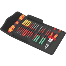 2 ручки-держателя 817 VDE для сменных отвёрток Wera VDE; 14 сменных отвёрток VDE (длиной 157 мм) с зауженным рабочим концом (артикул Kraftform Kompakt 60 i Take it easy 0,4x2,5 и Kraftform Kompakt 67 i Take it easy TX 10, стандартный диаметр рабочего конца), что позволяет получить доступ к глубоко посаженным винтовым и пружинным элементам и работать с ними. С идентификатором инструментов Take it easy: цветовая кодировка профиля и лазерная гравировка размера для простого и быстрого отбора нужного инструмента. Поштучная проверка инструментов по стандарту IEC 60900 под напряжением 10000 В для безопасной работы под допустимым напряжением 1000 В. 1 электромонтажные клещи Knipex VDE 13 96 200; заменяют до шести разных инструментов, используемых для электромонтажных работ - резания, удаления изоляции, захватывания, гибки, зачистки и опрессовки - всё в одном инструменте. Со стопорной защёлкой для безопасного обращения с инструментом. Хромирование для лучшей защиты от коррозии, с изолированными многокомпонентными чехлами на ручках. В добротной поясной сумке. Мягкая сумка имеет с обратной стороны зону на липучках. Используя прилагаемые полоски-липучки, такую сумку можно крепить к компонентам системы Wera 2go. А можно к стене, полке и инструментальной тележке.
