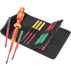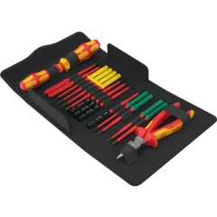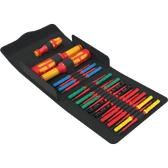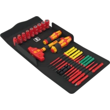 Универсальный набор для применения в системах VDE. Две ручки-держателя 837 i RA и 817 VDE для насадок Kraftform Kompakt VDE (837 i RA с трещоткой для ускоренного завинчивания). 11 насадок Kraftform Kompakt для винтов с прямым шлицем, винтов с крестообразной головкой (Phillips и Pozidriv) и винтов TORX®. Благодаря зауженному рабочему концу можно добраться даже до низко расположенных винтовых и пружинных элементов. Идентификатор инструмента Take it easy: (цветовая маркировка по профилю, а также индикация размера с лазерной гравировкой) позволяет легко найти нужную насадку. Одна Т-образная ручка с трещоткой для торцовых головок 1/4". Углубления в муфте свободного хода на насадке обеспечивают сопротивление, создаваемое усилием пальца, что позволяет использовать трещотку даже при низком сопротивлении винта. 9 головок обеспечивают повышенную безопасность благодаря двухкомпонентной изоляции с желтой изоляционной сердцевиной под внешним красным изоляционным слоем. Внутренний желтый изоляционный слой становится видимым, если поврежден внешний красный изоляционный слой VDE. Все инструменты проходят индивидуальную проверку при напряжении 10 000 Вольт в соответствии с IEC 60900. Компактное и безопасное хранение в мягком чехле. Мягкий чехол можно закрепить непосредственно на системе переноски инструментов Wera 2go или прикрепить к иснтрументальной тележке, стенке для инструментов и т.д. с помощью прилагаемых полос-липучек.