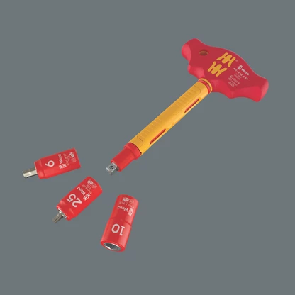 - Одна отвертка-переходник 410 i VDE A RA с Т-образной ручкой и трещоткой для торцевых и отверточных головок 1/4"