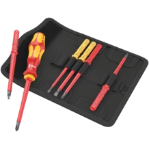 1 ручка-держатель 817 VDE Kraftform и 6 сменных отвёрток VDE с идентификатором инструментов Take it easy: цветовая кодировка и лазерная гравировка размера. Инструменты проверены поштучно по стандарту IEC 60900. Поштучная проверка под напряжением 10000 В для безопасной работы на оборудовании с допустимым напряжением 1000 В. В добротной поясной сумке. Мягкая сумка имеет с обратной стороны зону на липучках. Используя прилагаемые полоски-липучки, такую сумку можно крепить к компонентам системы Wera 2go. А можно к стене, полке и инструментальной тележке.