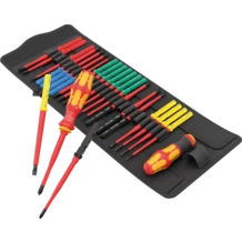 Набор Kraftform Kompakt VDE, 26 предметов. 2 ручки-держателя 817 VDE Kraftform, 24 сменных отвёрток VDE (длиной 157 мм) большая часть с зауженным рабочим концом (iS), что позволяет получить доступ к глубоко посаженным винтовым и пружинным элементам и работать с ними. Поштучная проверка инструментов по стандарту IEC 60900 под напряжением 10000 В для безопасной работы на оборудовании с допустимым напряжением 1000 В. С идентификатором инструментов Take it easy: цветовая кодировка профиля и лазерная гравировка размера для простого и быстрого отбора нужного инструмента. Ручка Kraftform Plus для комфортной работы без появления на руках мозолей и волдырей. Твердые зоны ручки для высокой скорости работы, в то время как мягкие зоны ручки обеспечивают передачу больших моментов силы. Шестигранный край инструмента предотвращает надоедливое перекатывание отвёртки на рабочем месте.