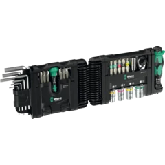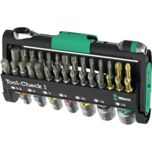 Набор из 38 предметов. Очень компактный набор инструментов для работы в ручном и машинном режимах. Зеленые фиксирующие элементы на панели инструментов надежно фиксируют инструменты во время транспортировки. Включает в себя одну трещотку 1/4", выполненную из цельной кованой стали. Механизм с тонким механизмом зацепления (60 зубьев) и небольшим углом возврата в 6° для точных манипуляций. Простое переключение по часовой стрелке / против часовой стрелки. Головка трещотки и рычаг эргономичной формы. Головки 1/4" также можно использовать с переходником Wera 870/1 (внешний шестигранник 1/4" на внешнюю квадратную головку 1/4"), входящим в комплект поставки. 7 головок Zyklop (1/4", для ручного и механического инструмента); с канавкой под шариковый фиксатор. Рифление по заднему краю для уверенного хвата при ручном завинчивании. Идентификаторы инструментов Take it easy: цветовая кодировка по размеру - для быстрой и легкой идентификации необходимого инструмента. Изготовлен из матово-хромированного хром-ванадия. 28 прочных насадок (с крестообразной головкой Phillips и Pozidriv, TORX®, TORX® BO, с прямым шлицем и посадочным гнездом под шестигранник) для универсального использования. В очень компактном и функциональном Tool-Check.