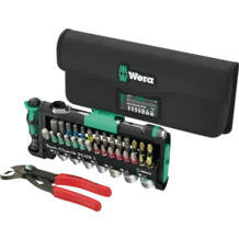 Набор из 40 предметов. Очень компактный набор инструментов для ручного и машинного использования. Зеленые фиксирующие элементы Tool-Check надежно фиксируют инструменты во время транспортировки. Включает в себя одну ручку-трещотку для битов 1/4", выполненную из цельной кованой стали. Тонкий механизм зацепления (60 зубьев) и малый угол возврата в 6° для точных манипуляций. Простое переключение по часовой стрелке / против часовой стрелки. Головка трещотки и рычаг эргономичной формы. Головки 1/4" также можно использовать с переходником Wera 870/1 (внешний шестигранник 1/4" на внешнюю квадратную головку 1/4"), входящим в комплект поставки. 7 головок Zyklop (1/4", для ручного и машинного инструмента); с канавкой под шариковый фиксатор. Рифление по заднему краю для уверенного хвата при ручном завинчивании. Идентификатор инструмента Take it easy: цветовая маркировка по размеру-для быстрой и легкой идентификации необходимого инструмента. Изготовлен из матового хромированного хромованадиевого сплава. 28 битов, конструкция BTZ и BTH с торсионной зоной (предотвращает преждевременную поломку долота) и идентификатор инструмента Take it easy: цветовая маркировка по профилю и размеру, закалка до вязкой твёрдости (Z) для универсального применения, Phillips и Pozidriv, TORX®, TORX® BO, внутренний шестигранник и прямой шлиц. Одни высокотехнологичные плоскогубцы KNIPEX Cobra® 87 01 125-для водяного насоса. В очень компактном и функциональном наборе Tool-Check. Один прочный чехол.