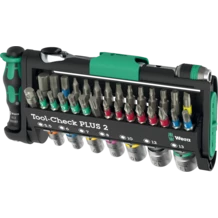 Набор из 39 предметов. Очень компактный набор инструментов для работы в ручном и машинном режимах. Зеленые фиксирующие элементы на панели инструментов надежно фиксируют инструменты во время транспортировки. Включает в себя одну трещотку 1/4", выполненную из цельной кованой стали. Механизм с тонким механизмом зацепления (60 зубьев) и небольшим углом возврата в 6° для точных манипуляций. Простое переключение по часовой стрелке / против часовой стрелки. Головка трещотки и рычаг эргономичной формы. Головки 1/4" также можно использовать с переходником Wera 870/1 (внешний шестигранник 1/4" на внешнюю квадратную головку 1/4"), входящим в комплект поставки. 7 головок Zyklop (1/4") для ручного и механического инструмента; с канавкой под шариковый фиксатор. Рифление по заднему краю для уверенного хвата при ручном завинчивании. Идентификаторы инструментов Take it easy: цветовая кодировка по размеру - для быстрой и легкой идентификации необходимого инструмента. Изготовлен из матово-хромированного хром-ванадия. 28 бит, конструкция BTZ BiTorsion (предотвращает преждевременную поломку бит) и удобный поиск инструмента: цветовая маркировка с помощью штамповки профиля и размера, прочная конструкция (Z) для универсального использования, крестовая головка Phillips, TORX®, TORX® BO, прямой шлиц и квадратная головка. В очень компактном и функциональном Tool-Check.