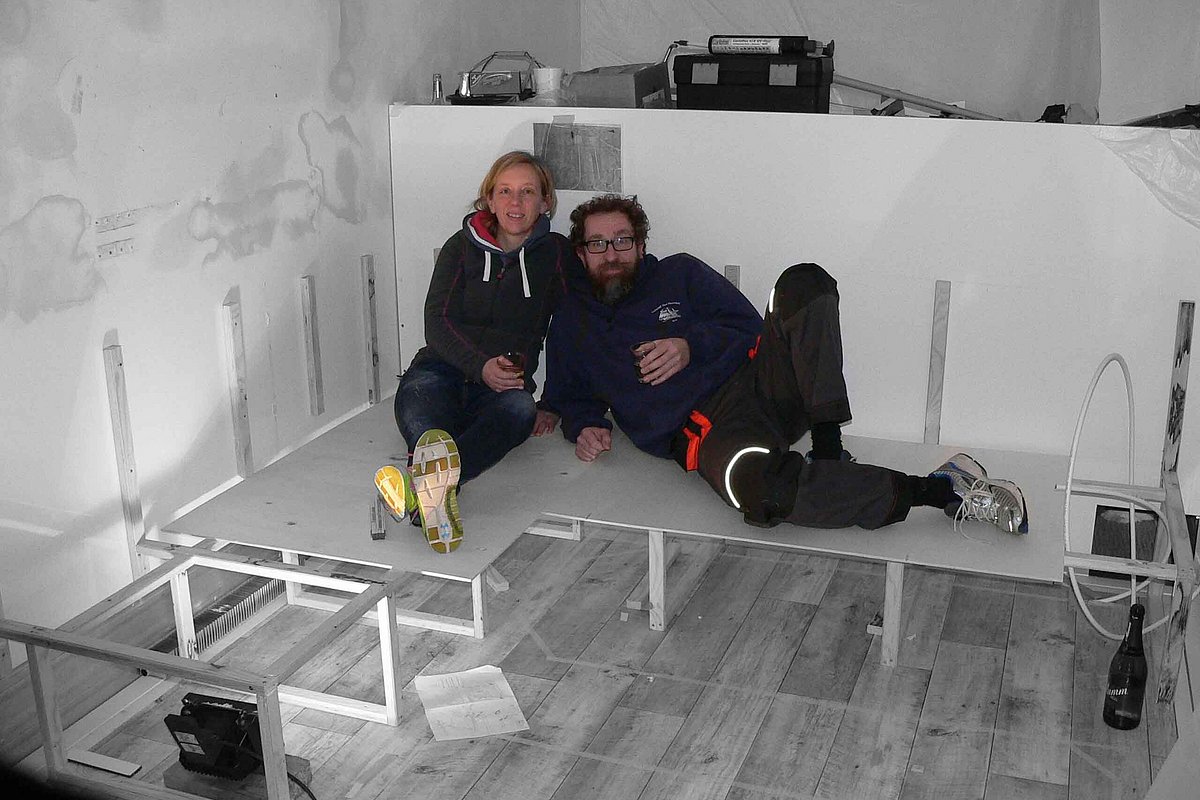 Промежуточный итог на март 2016 года: Внутренние стены обработаны, перегородки и подиум для кровати установлены, отопление готово на 80 %. Первые предметы мебели были необходимы. У нас было два места, которые мы часто посещали: Одно — шведский мебельный магазин, продающий мебель в разобранном виде. Это было большим преимуществом для нас из-за необходимых модификаций. Другое — ближайший строительный магазин, где мы нашли ламинированные деревянные профили и тонкие многослойные панели, обеспечивающие изящную, относительно легкую, но стабильную конструкционную основу для сидячей мебели.