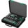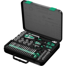 Zyklop-sats med 43 delar i robust metallåda: Zyklop-spärrskaft med 1/4"-fattning och Zyklop-spärrskaft med 1/2"-fattning. På grund av den tätstegade tandningen med 72 tänder möjliggörs en returvinkel på bara 5°. Spärrhuvudet är fritt svängbart och kan låsas i vilket läge som helst med skjutvredet på båda sidorna. Problemfritt arbete med stor rörelsefrihet tillåts även i mycket trånga och svårtillgängliga installationssituationer. Den definierade fixeringen vid 0°, 15° och 90° åt vänster och höger garanterar säkert arbete utan att spärrhuvudet glider. I 0°-positionen kan spärrskaftet med adapter och bit användas som en vanlig skruvmejsel. Svängmassekonstruktionen gör skruvningsprocessen snabbare. Den rotationssymmetriska strukturen hos Kraftform-greppet och frihjulshylsan möjliggör snabb rotation. Formen på Kraftform-greppet, som är perfekt anpassat för handen, förebygger blåsor och valkar. De hårda materialen som används i greppet garanterar snabb hantering utan risk att materialet "klibbar" mot huden. De mjukare "glidsäkra" zonerna tillåter förlustfri överföring av stora krafter. För 1/4" fyrkant-hylsmejselinsatser liksom 1/4" adaptrar med fyrkantsfattning, med kulspärr. Med 21 Zyklop-hylsor, 2 Zyklop-förlängningar med frihjulshylsa, 1 Kraftform bitshandtag med snabbfäste, 16 bits. Med verktygsväljare Take it easy: Färgkodning enligt storlekar.