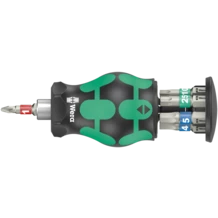 Stubbymagasin för snabba ingrepp på cyklar. Extra litet bitshandtag med kort bitshållare för svåråtkomliga punkter. Inklusive 7 bits av rostfritt stål, varav 6 finns i ett magasin i handtaget och 1 i bitshållaren. Kraftform-greppet i 2-komponentsmaterial, med sin praktiska kombination av hårda och mjuka greppytor, tillåter ett fast grepp och exakt arbete. Verktygsväljare Take it easy: Med färgkodning av fattningen och storleksstämpel för enkel sökning av önskad bits.